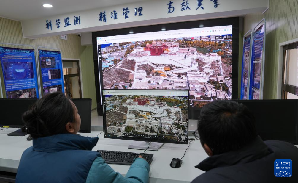 12月4日,布達(dá)拉宮監(jiān)測(cè)中心的工作人員在查看無人機(jī)拍攝的圖像。新華社記者 晉美多吉 攝