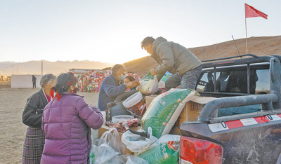 1月8日,在定日縣長所鄉(xiāng)古榮村安置點,志愿者為受災群眾發(fā)放物資。人民網記者 翁奇羽攝