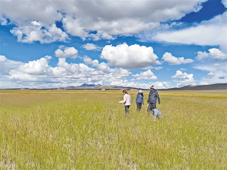 科研人員視察那曲市色尼區(qū)那么切鄉(xiāng)生態(tài)修復點牧草長勢情況。