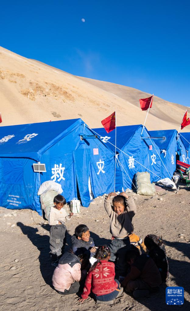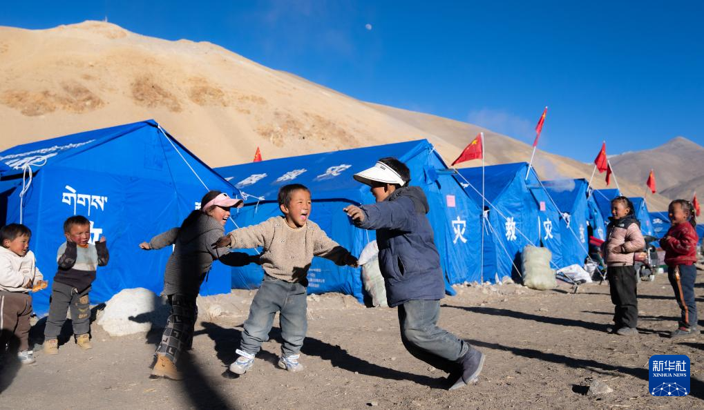 1月10日,孩子們?cè)诙ńY(jié)縣郭加鄉(xiāng)切村安置點(diǎn)玩耍。新華社記者 丁增尼達(dá) 攝