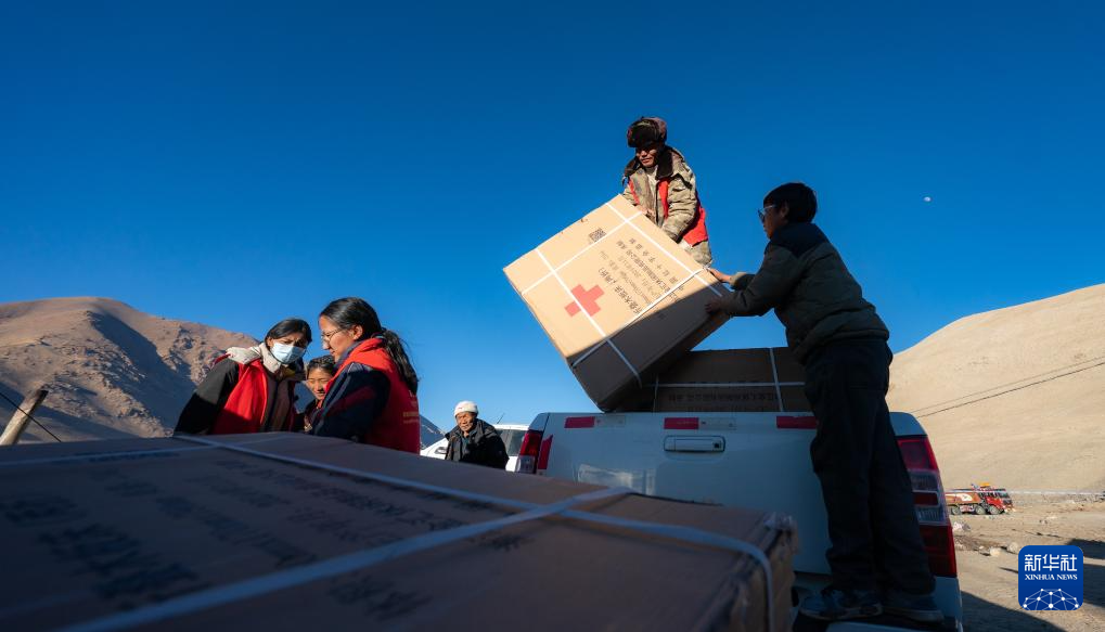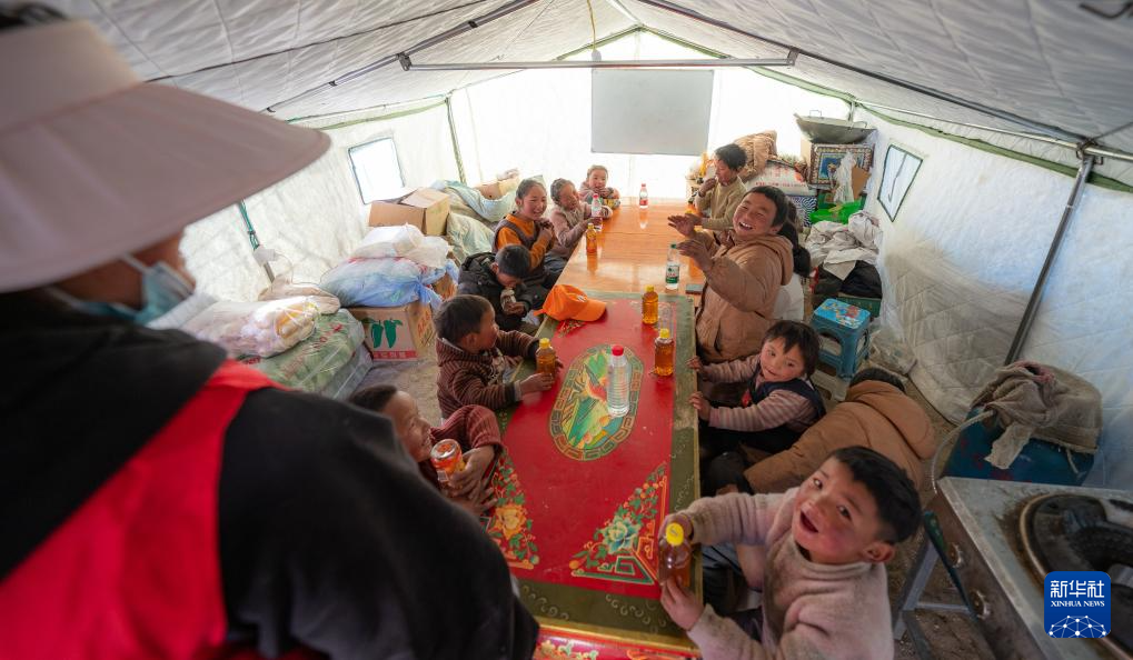 1月10日,在定結(jié)縣郭加鄉(xiāng)切村安置點(diǎn),群眾分配救災(zāi)物資。新華社記者 丁增尼達(dá) 攝
