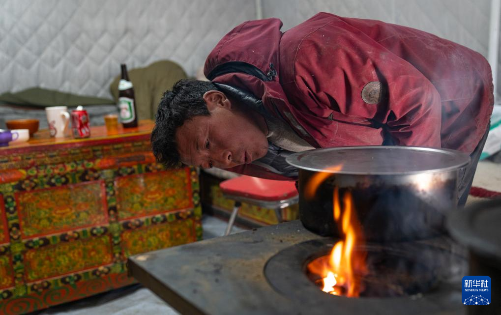 1月10日,在定結(jié)縣郭加鄉(xiāng)切村安置點(diǎn),群眾在救災(zāi)帳篷里生火。新華社記者 丁增尼達(dá) 攝