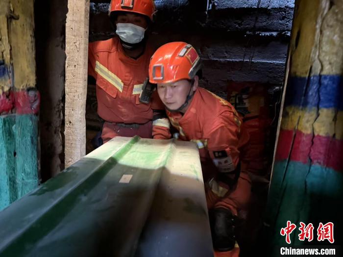 圖為日喀則市森林消防大隊隊員在受損房屋內搜尋受災村民財產(chǎn)。米瑪次仁 攝