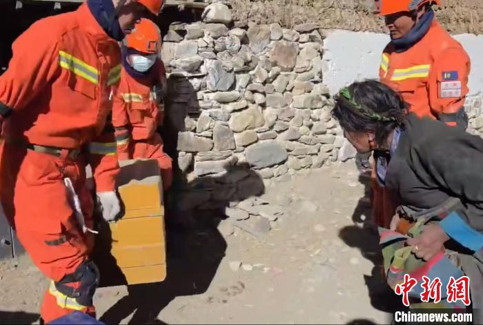 圖為日喀則市森林消防大隊隊員將受損房屋內搜尋到的財物交付受災村民手中。米瑪次仁 攝