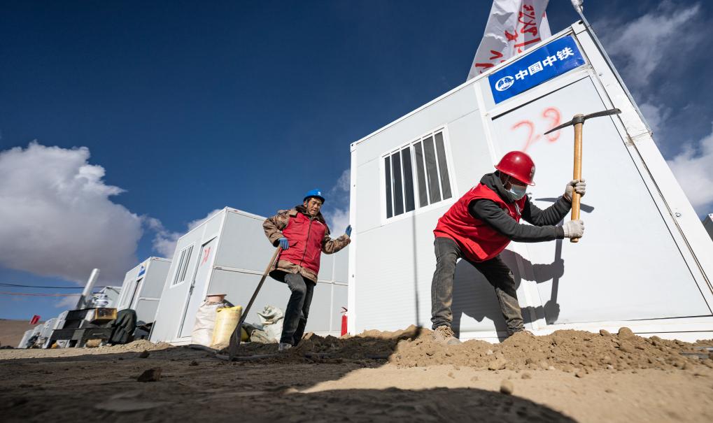 在定日縣長(zhǎng)所鄉(xiāng)嘎旦村,國家電網(wǎng)工作人員在挖槽預(yù)埋電線(1月13日攝)。新華社記者 丁增尼達(dá) 攝