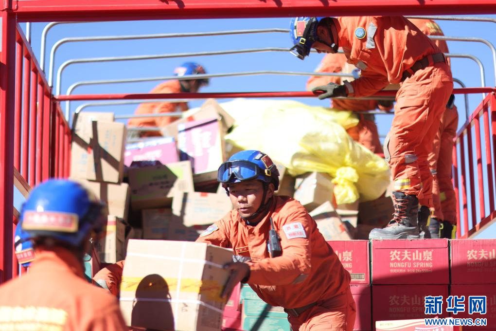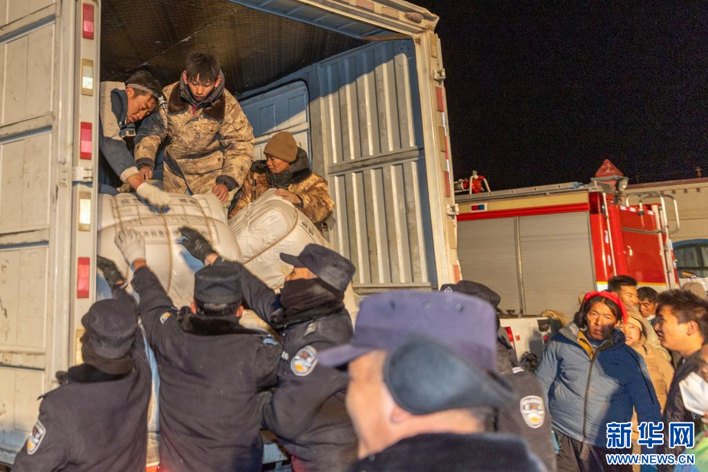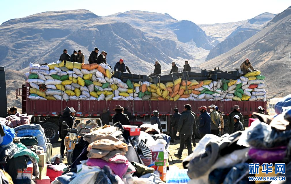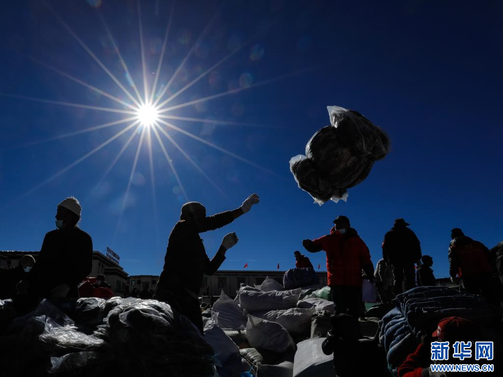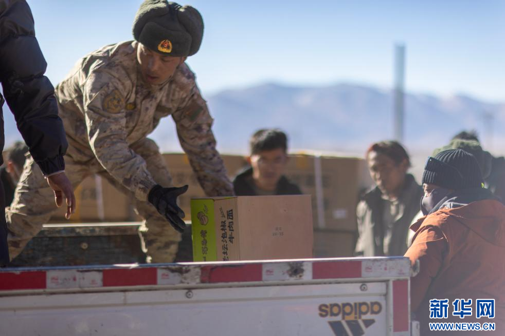 1月10日,在定日縣民族團(tuán)結(jié)廣場(chǎng),人們搬運(yùn)將要運(yùn)往受災(zāi)群眾安置點(diǎn)的過(guò)冬物資。新華社記者 沈伯韓 攝