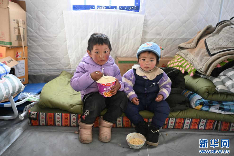 1月9日,拉孜縣芒普鄉(xiāng)一處安置點(diǎn)內(nèi),小朋友在溫暖的帳篷里吃泡面。新華社記者 李響 攝