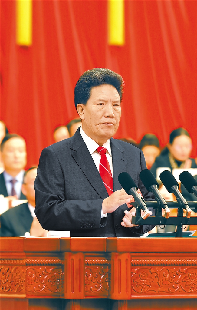 全國人大常委會(huì)副委員長、自治區(qū)人大常委會(huì)主任洛桑江村向大會(huì)作自治區(qū)人大常委會(huì)工作報(bào)告。記者 次仁平措 攝