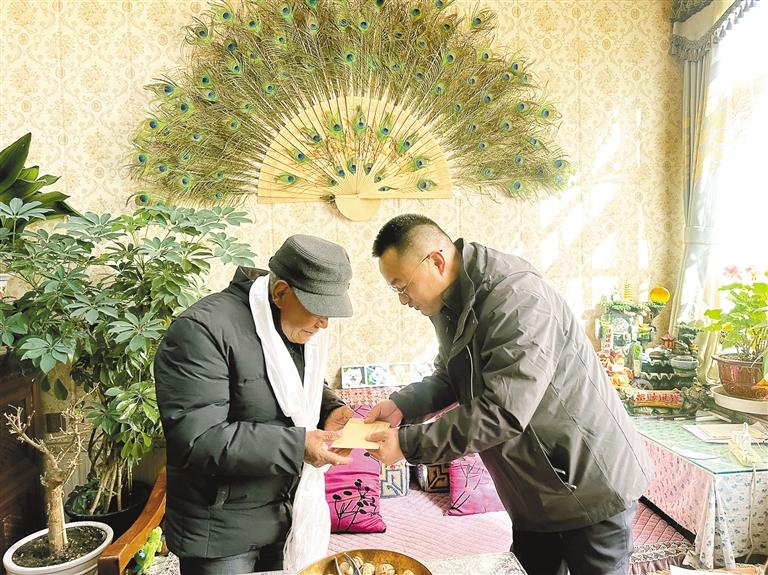圖為拉薩市人民政府辦公室相關(guān)負責人為離退休干部職工敬獻哈達并送上慰問金。記者 劉琳琳 攝