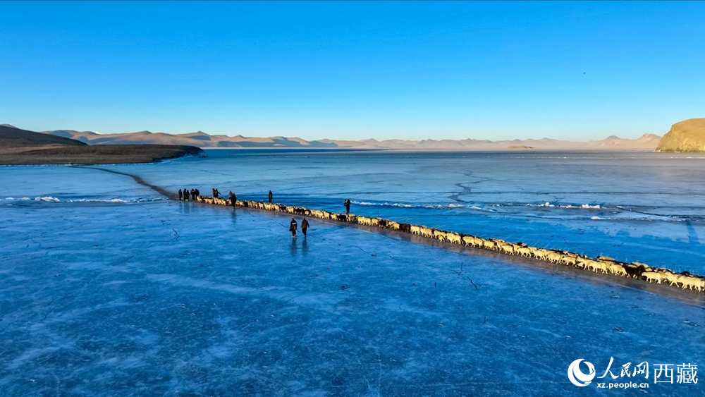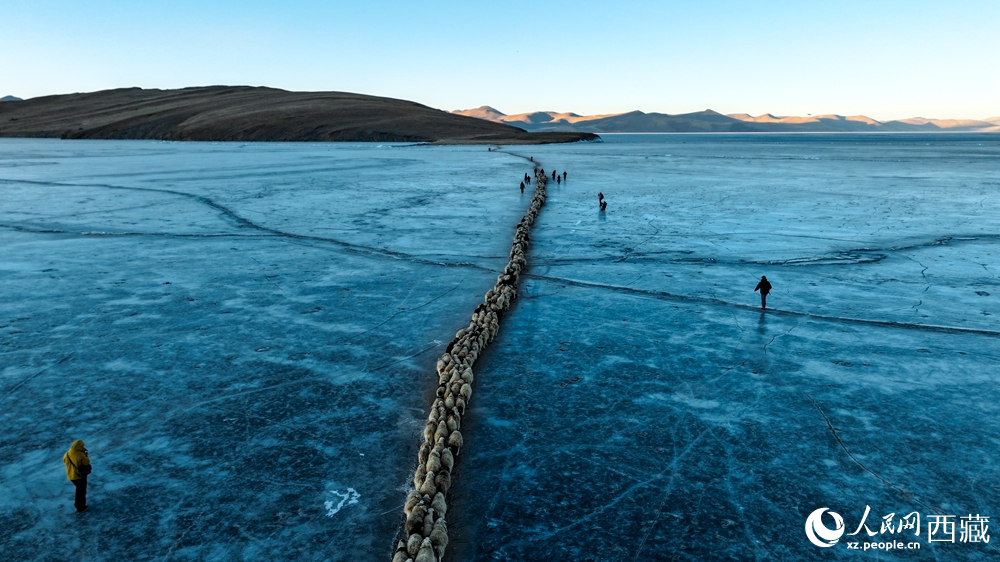 隨著一聲號(hào)令,牧民們驅(qū)趕著羊群,踏上冰封的湖面。遠(yuǎn)遠(yuǎn)望去,羊群如同一串串黑白相間的珍珠,在湛藍(lán)的冰面上緩緩移動(dòng),構(gòu)成一幅壯美的高原畫(huà)卷。