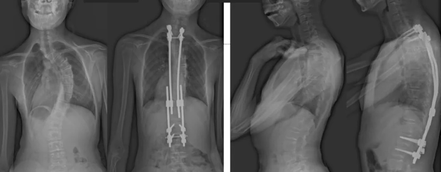 白瑪今年10歲,正在讀小學(xué)。媽媽發(fā)現(xiàn),白瑪經(jīng)常歪著肩膀,在反復(fù)提醒“站直了,別歪著”后,情況也沒有改善。近半年來,白瑪?shù)挠覀?cè)肩胛骨逐漸向后凸出。到醫(yī)院檢查后發(fā)現(xiàn),白瑪?shù)男刈荡嬖诿黠@的側(cè)凸畸形,是早發(fā)型特發(fā)性脊柱側(cè)凸。由于側(cè)凸較為嚴(yán)重,已經(jīng)失去了支具治療的機會。小白瑪才10歲,隨著身體的不斷成長,她的脊柱會越來越彎,肩膀會越來傾斜。這不僅影響體態(tài)和外觀,也可能限制心、肺等內(nèi)臟器官的發(fā)育,導(dǎo)致心肺功能下降、肢體活動不便,出現(xiàn)癱瘓,甚至死亡。對于白瑪這種情況,只能利用手術(shù)治療來矯正脊柱、阻止骨骼畸形進(jìn)展。