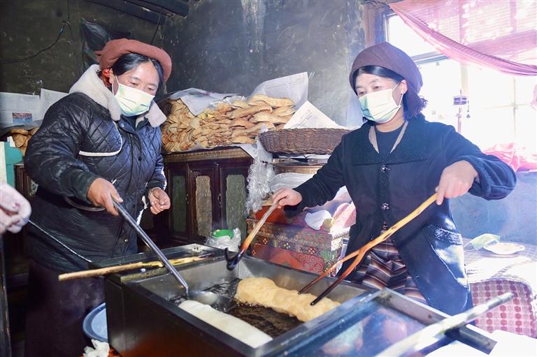 “德卡”,作為傳統(tǒng)藏式點(diǎn)心“卡塞”的一種,在藏歷新年的年貨清單里占據(jù)著不可或缺的位置。每到藏歷新年前夕,旦索朗一家便進(jìn)入了一年中最忙碌的時(shí)段——經(jīng)營(yíng)起制作和售賣(mài)卡塞的生意。旦索朗回憶起小時(shí)候的新年,感慨萬(wàn)分:“小時(shí)候過(guò)年,家家戶(hù)戶(hù)都自己炸卡塞,那時(shí)候,整個(gè)村子都被卡塞的濃香包圍著?,F(xiàn)在生活條件好了,很多人覺(jué)得在外購(gòu)買(mǎi)德卡更方便省事,這也給我們帶來(lái)了商機(jī)。我們做炸德卡的生意已經(jīng)6年了,一直都很受歡迎,還帶動(dòng)了6名村民一起參與,增加了大家的收入。”