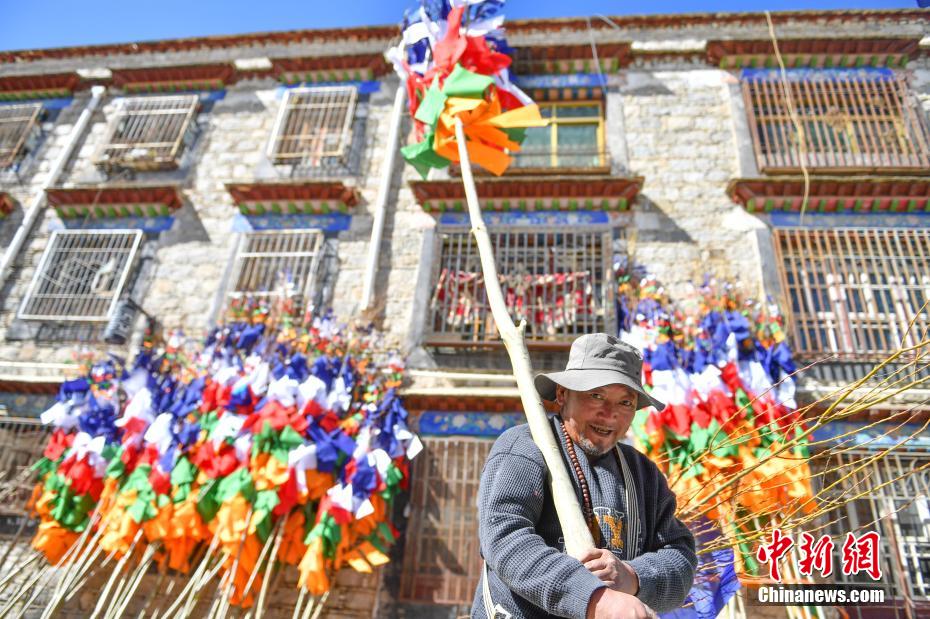 臨近藏歷新年,2月16日,在西藏拉薩街頭,農牧民正縫制五彩經幡樹。五彩經幡樹是藏族民眾在藏歷新年前必備的年貨之一。藏歷新年期間,藏族民眾會選擇一個良辰吉日,為自家的房頂更換五彩經幡樹,祈求新的一年里五谷豐登,吉祥如意。圖為2月16日,頓珠扛著五彩經幡樹。貢確 攝