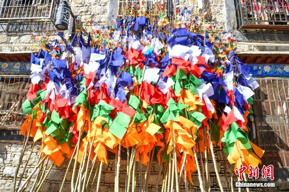 臨近藏歷新年,2月16日,在西藏拉薩街頭,農牧民正縫制五彩經幡樹。五彩經幡樹是藏族民眾在藏歷新年前必備的年貨之一。藏歷新年期間,藏族民眾會選擇一個良辰吉日,為自家的房頂更換五彩經幡樹,祈求新的一年里五谷豐登,吉祥如意。圖為2月16日,制作完成的五彩經幡樹。貢確 攝