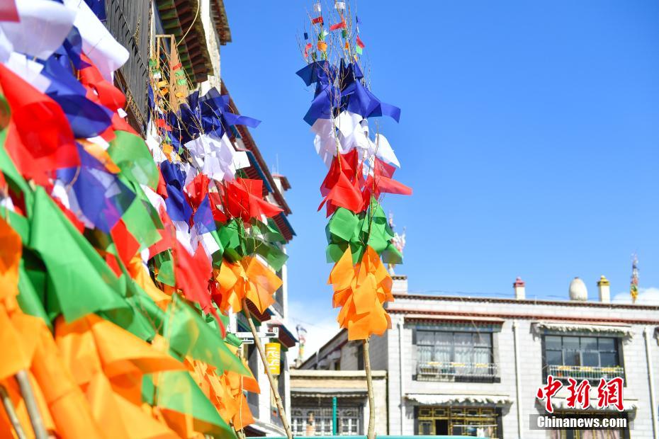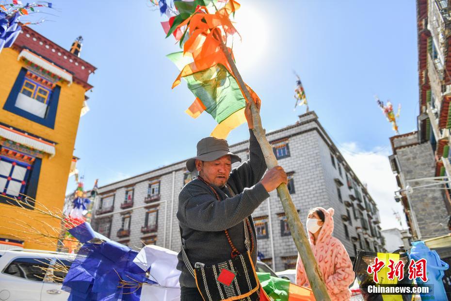 臨近藏歷新年,2月16日,在西藏拉薩街頭,農牧民正縫制五彩經幡樹。五彩經幡樹是藏族民眾在藏歷新年前必備的年貨之一。藏歷新年期間,藏族民眾會選擇一個良辰吉日,為自家的房頂更換五彩經幡樹,祈求新的一年里五谷豐登,吉祥如意。圖為2月16日,普瓊在給顧客展示五彩經幡樹。貢確 攝