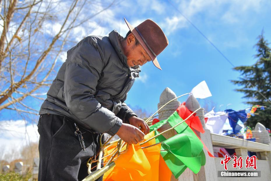 臨近藏歷新年,2月16日,在西藏拉薩街頭,農牧民正縫制五彩經幡樹。五彩經幡樹是藏族民眾在藏歷新年前必備的年貨之一。藏歷新年期間,藏族民眾會選擇一個良辰吉日,為自家的房頂更換五彩經幡樹,祈求新的一年里五谷豐登,吉祥如意。圖為2月16日,頓珠正在縫制五彩經幡樹。貢確 攝