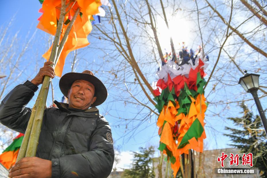 臨近藏歷新年,2月16日,在西藏拉薩街頭,農牧民正縫制五彩經幡樹。五彩經幡樹是藏族民眾在藏歷新年前必備的年貨之一。藏歷新年期間,藏族民眾會選擇一個良辰吉日,為自家的房頂更換五彩經幡樹,祈求新的一年里五谷豐登,吉祥如意。圖為2月16日,來自尼木縣的普瓊扛著五彩經幡樹。貢確 攝