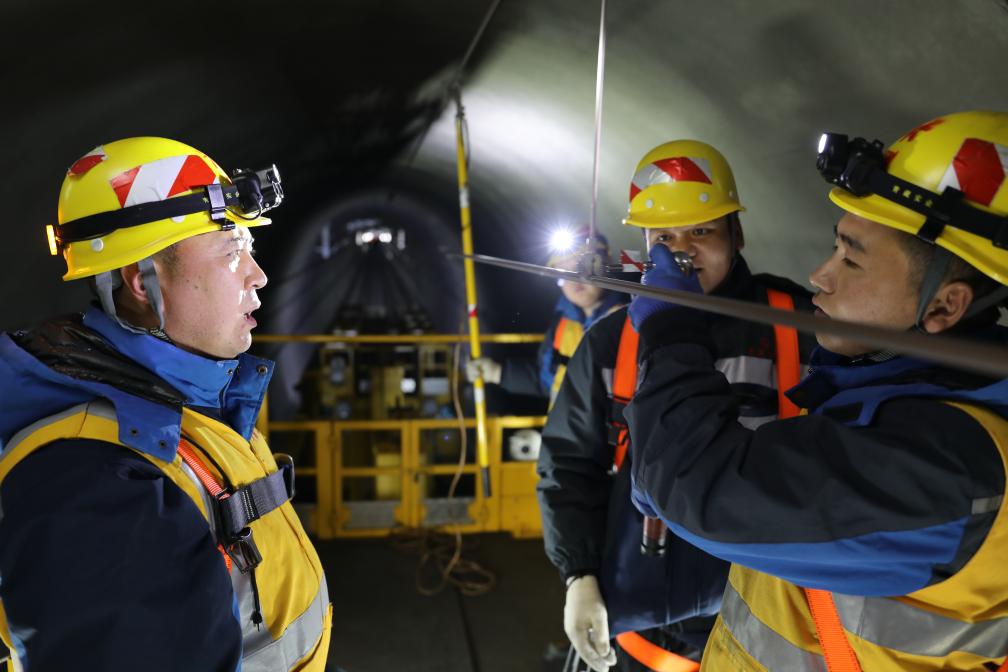 春運(yùn)期間,接觸網(wǎng)工人劉海軍在拉林鐵路色拉丘隧道內(nèi)為接觸網(wǎng)更換絕緣子。(拉巴次仁攝)