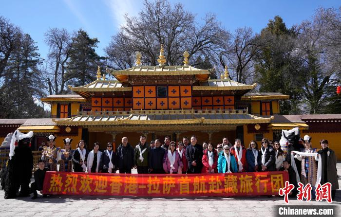圖為歡迎儀式現(xiàn)場(chǎng),香港游客在羅布林卡與身著拉薩傳統(tǒng)服飾的工作人員合影留念。中新社記者 李林 攝