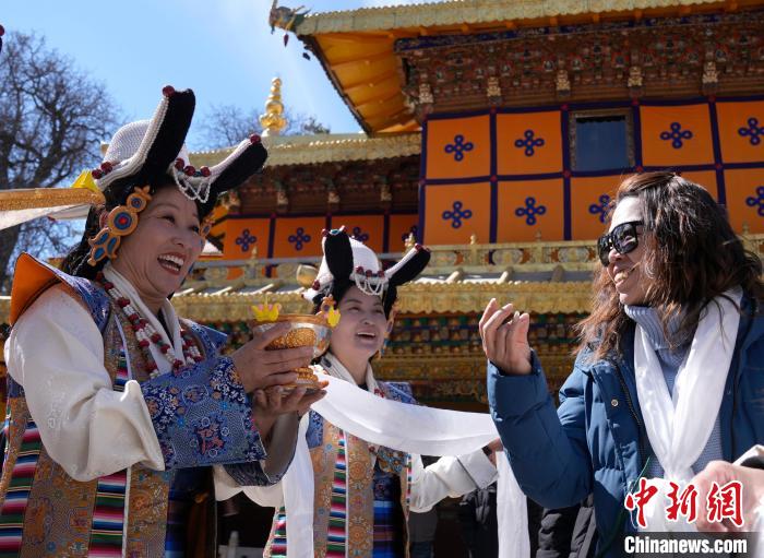2月20日,由西藏自治區(qū)文化和旅游廳舉辦的2025年香港至拉薩航班首航旅行團(tuán)歡迎儀式在羅布林卡舉行。來自香港的游客將前往布達(dá)拉宮、大昭寺等地,開啟冬游西藏旅途。2月19日,拉薩至香港的首條地區(qū)航線正式開通。航線的開通,更加便捷了兩地居民的出行,也將進(jìn)一步促進(jìn)兩地在旅游、文化、經(jīng)貿(mào)等領(lǐng)域的交流與合作。圖為歡迎儀式現(xiàn)場(chǎng),工作人員向香港游客敬獻(xiàn)青稞酒。中新社記者 李林 攝