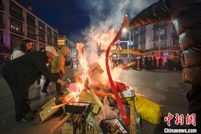 藏歷新年是西藏傳統(tǒng)民俗活動(dòng),也是中國國家級(jí)非物質(zhì)文化遺產(chǎn)。2月27日,西藏迎來一年一度的藏歷新年古突夜(類似春節(jié)的除夕),如今過古突夜,西藏民眾在點(diǎn)燃火把的同時(shí),也會(huì)燃放煙花,古城拉薩煙花璀璨。圖為2月27日晚,吃完古突(一種藏式面食)后,拉薩市民在街頭燃燒火把、燃放鞭炮等,迎接藏歷新年的到來。中新社記者 江飛波 攝