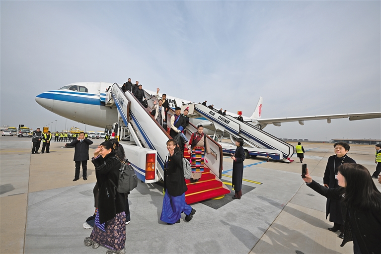 圖為西藏參加全國兩會的代表委員乘機(jī)抵達(dá)北京。 記者 旦增西旦 攝