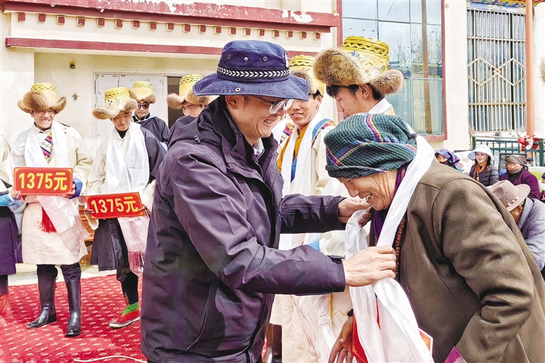“羅薩扎西德勒!這是您家的分紅款!”定結(jié)鄉(xiāng)黨委副書記、鄉(xiāng)長高文雄為75歲的村民央金遞上分紅紅包并表達自己的祝福。長桌上,“卡賽”、青稞酒擺成“豐收塔”;長桌旁,8.8萬元分紅款化作“新年紅包”,村民們揣著紅包看表演,共同分享村集體經(jīng)濟發(fā)展的豐碩成果,藏歷新年的喜慶與鄉(xiāng)村振興的碩果在此刻交融。