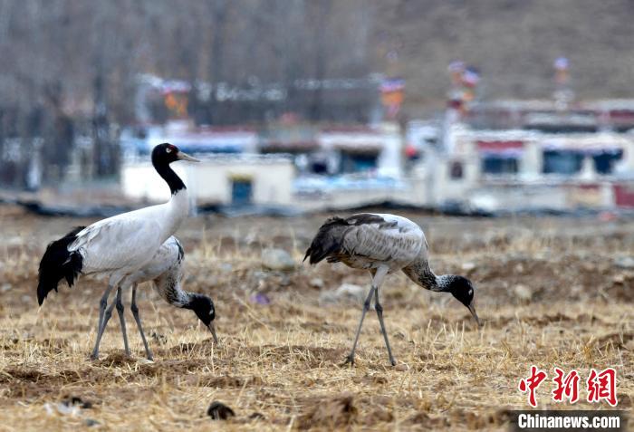 圖為3月8日,西藏拉薩林周縣黑頸鶴保護(hù)區(qū),黑頸鶴在田間覓食。中新社記者 李林 攝
