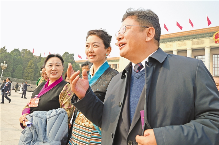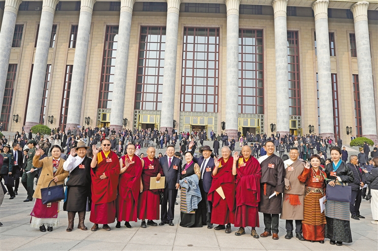 圖為住藏全國政協(xié)委員等參會人員在人民大會堂前合影留念。記者 旦增平措 次旦央吉 攝