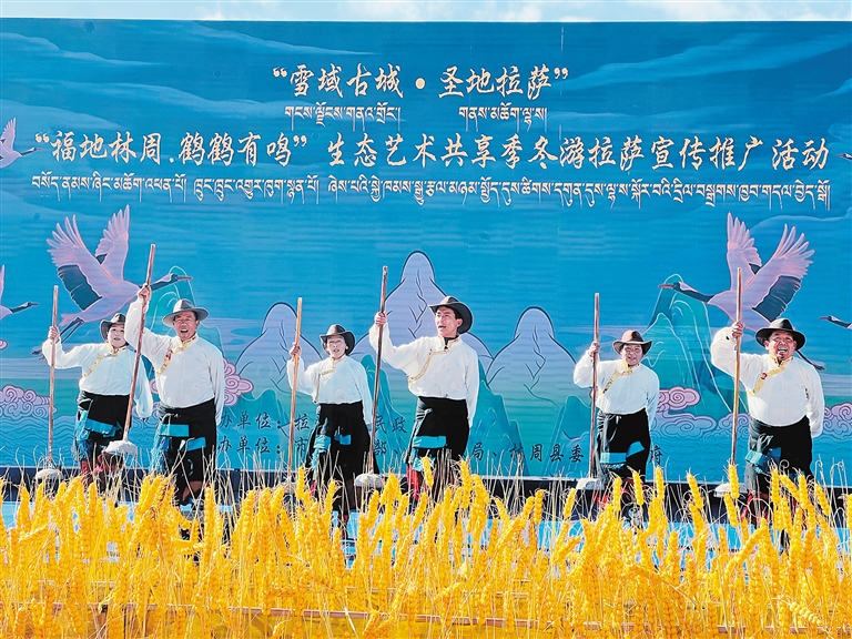 當(dāng)溫暖的陽(yáng)光輕柔地灑在拉薩河谷,黑頸鶴清脆的鳴叫聲喚醒了林周濕地寧?kù)o的清晨。“福地林周·鶴鶴有鳴”生態(tài)藝術(shù)共享季之“冬游拉薩”宣傳推廣活動(dòng),以歌舞表演、生態(tài)主旨演講、黑頸鶴攝影作品展、鶴文化專家座談等,融合了生態(tài)、藝術(shù)與文化的盛宴,讓人在雪山、湖泊與鶴影交織的詩(shī)意中,感受“冬游拉薩”的獨(dú)特魅力。