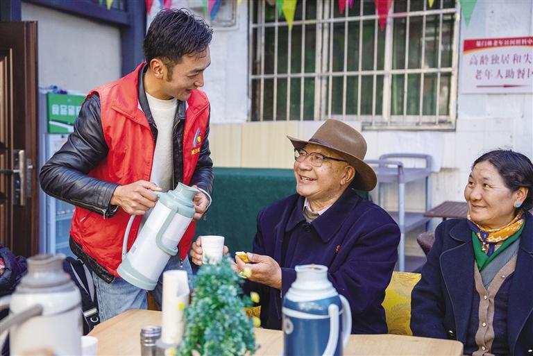 “波啦,您來啦,快坐下來喝點熱茶。”“莫啦,待會午飯在這邊吃嗎?”近日,記者來到拉薩市城關(guān)區(qū)蕃陽社會工作者和志愿者服務(wù)協(xié)會下的策門林老年日間照料中心,剛進大門就被一群正在鍛煉身體的老人所吸引。他們跟著老師抬手、踢腿、扭腰,動作整齊劃一,臉上洋溢著幸福的笑容。鍛煉結(jié)束后,赤來回到助餐區(qū),邊喝甜茶邊吃“卡賽”,和老人們分享趣聞,拉著家常,現(xiàn)場傳來一陣陣歡聲笑語。