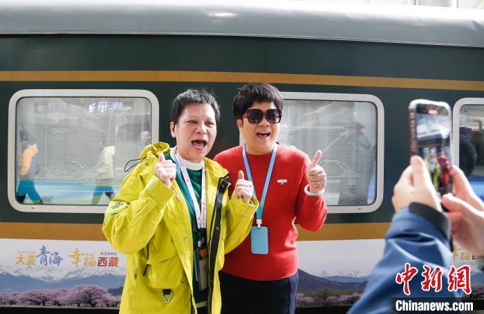 3月26日,乘坐青海首趟直達(dá)西藏林芝旅游專(zhuān)列的旅客與列車(chē)合影留念?!●R銘言 攝