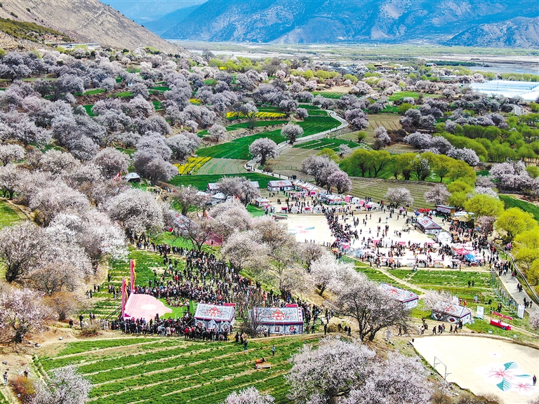4月3日上午,林芝第二十二屆桃花旅游文化節(jié)巴宜區(qū)分會(huì)場(chǎng)活動(dòng)在布久鄉(xiāng)朵當(dāng)村桃花園舉行。圖為游客在朵當(dāng)村桃花園賞花游玩(無(wú)人機(jī)照片)。記者 劉楓 謝筱純 攝