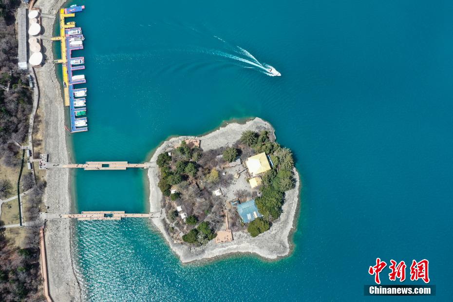 4月6日,西藏林芝工布江達(dá)縣巴松措景區(qū)游人如織。春日里,湛藍(lán)湖水與巍峨雪山相映成趣,游客游玩湖心島或乘船游覽,沉醉在這湖光山色中。圖為巴松措里的游船。(無(wú)人機(jī)照片)中新社記者 貢嘎來(lái)松 攝