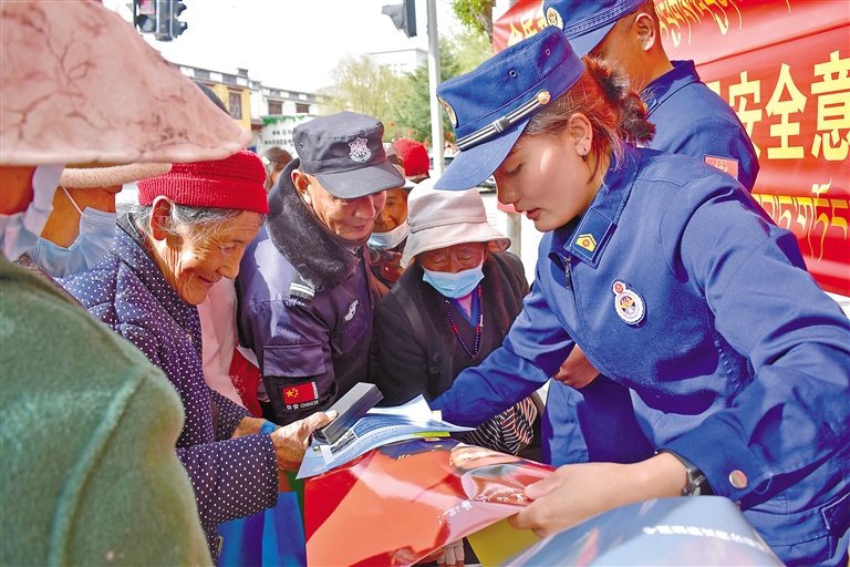 4月15日,山南市瓊結(jié)縣組織開展第十個全民國家安全教育日系列宣傳活動。圖為瓊結(jié)縣消防救援大隊工作人員向群眾發(fā)放宣傳資料。記者 孫開遠 攝