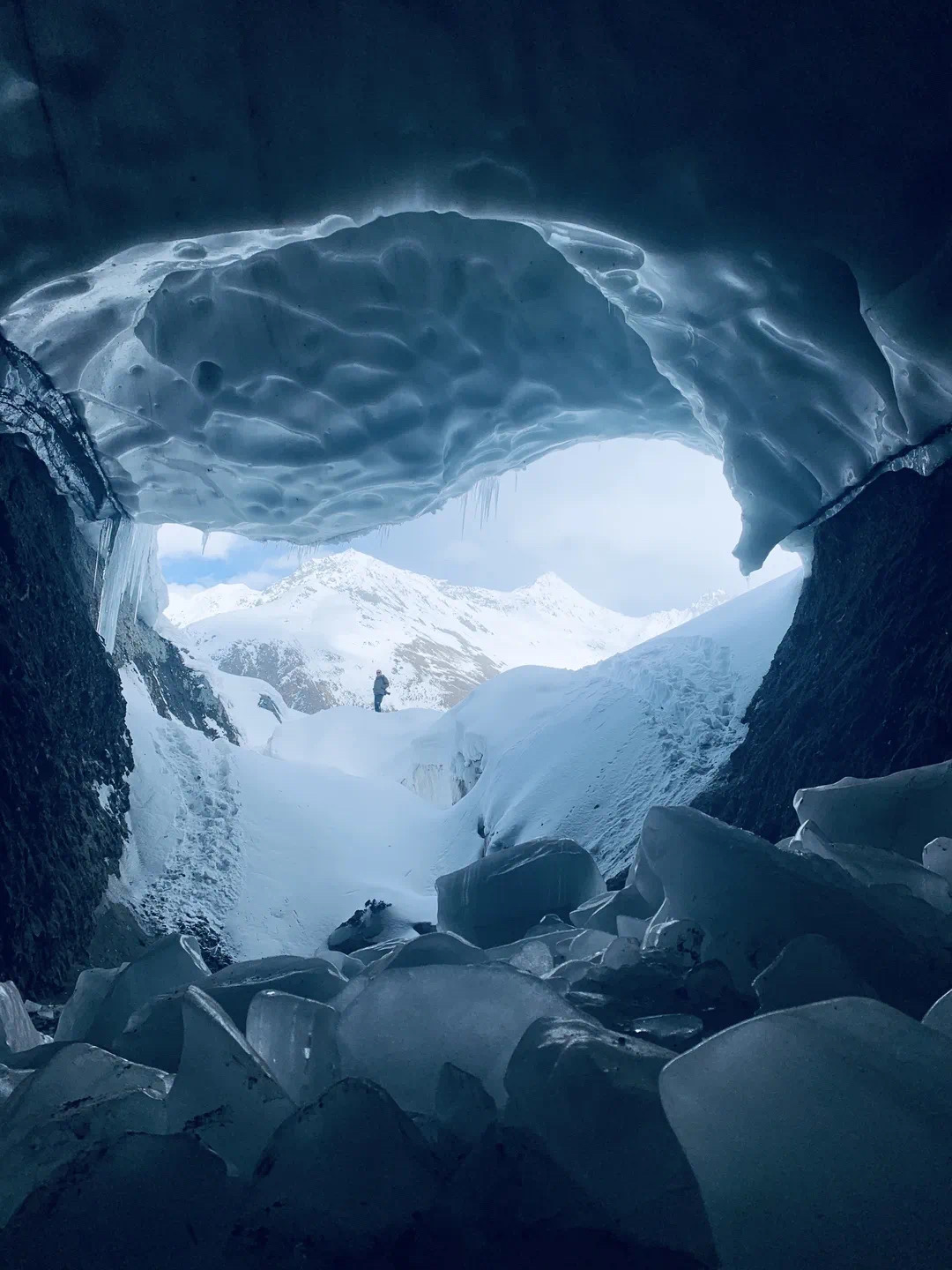 冰洞入口高約1米,需要彎著腰才能進入。待完全進入后,空間逐漸開闊,冰洞內(nèi)別有洞天。冰壁深處透著蔚藍,似是把邊壩的藍天鎖了進去。冰洞最開闊的地方有一處冰臺,游客在那里打卡拍照,記錄下這絕美的風光。