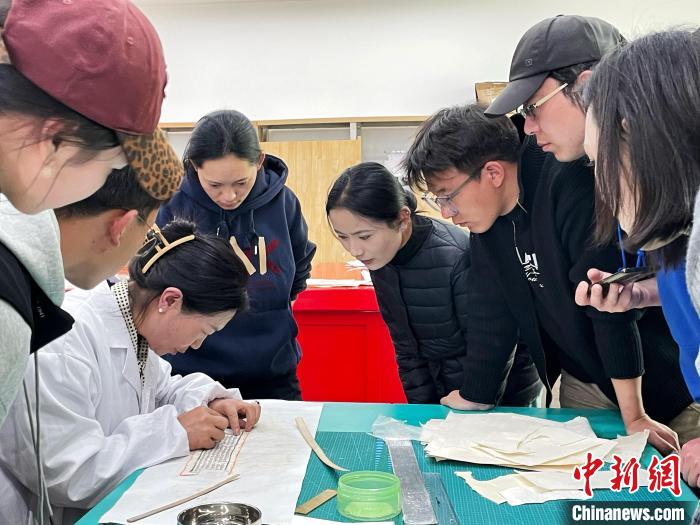 4月22日,西藏大學(xué)圖書(shū)館特藏部老師德吉曲珍為學(xué)生上古籍修復(fù)課程,所使用的為仿真古籍。中新社記者 趙朗 攝