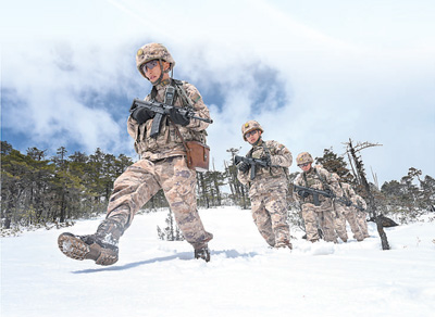 “墨脫戍邊模范營(yíng)”戍邊官兵踏雪巡邏。馬軍攝
