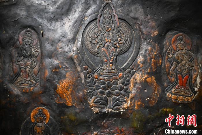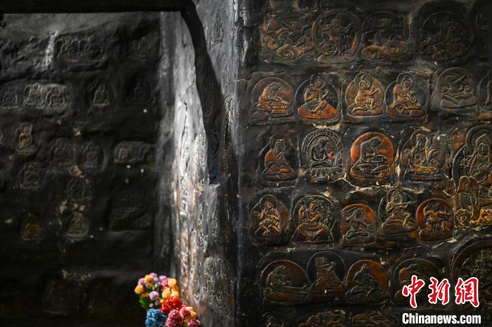 4月27日,記者探訪了當(dāng)雄縣貢堂鄉(xiāng)沖嘎爾村康馬寺的瑪尼拉康。瑪尼拉康是該寺除修行洞之外的早期宗教活動場所,也是寺院里最古老的建筑。這里保存著令人驚嘆的石刻造像墻,這些石刻距今已有三百年歷史?,斈崂低庥^普通,但其室內(nèi)六面墻上整齊地貼滿了浮雕石刻板,共計1213塊(僅一塊缺失)。石刻內(nèi)容豐富,涵蓋了藏傳佛教各宗各派的本尊、祖師、佛母菩薩等,造型多姿多樣,線條清晰流暢。這處石刻造像墻對于研究西藏傳統(tǒng)雕刻、藏傳佛教以及歷史具有重大意義。中新社記者 貢嘎來松 攝