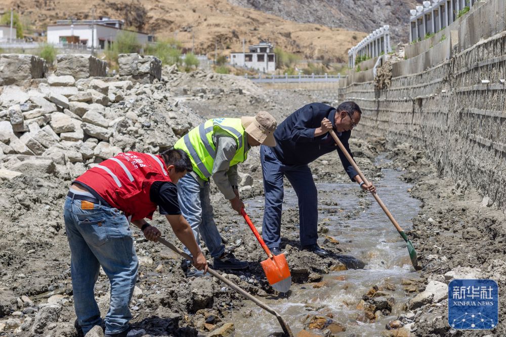 尼瑪(右一)與防汛工作人員一起巡查村中水道(4月24日攝)。