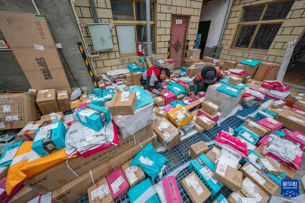 拉巴(左)和同事在站點內(nèi)整理快遞(4月24日攝)。新華社記者 丁增尼達 攝