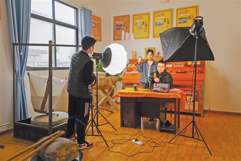圖為洛隆縣洛宗特色產(chǎn)品開發(fā)公司的工作人員正在直播銷售青稞掛面及青稞餅干。記者 丹增群培 攝