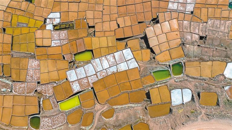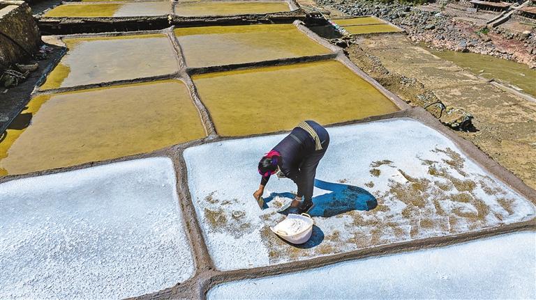 鹽田里,60歲的乃柯正和丈夫一起用木拍夯實(shí)鹽田?!艾F(xiàn)在用泵抽水輕松多了,但拍鹽田的手藝不能丟。”老人的話語中,既有對(duì)科技的接納,也有對(duì)傳統(tǒng)的堅(jiān)守。鹽田下方,鹽晶垂落成簾,在山風(fēng)拂動(dòng)下閃爍微光,仿佛在訴說著什么。一塊塊鹽田如同一面面鏡子,既映照出千年文明的厚重,也折射著鄉(xiāng)村振興的希望。當(dāng)鹽民們輕掃鹽田,他們掃的不僅是晶瑩的鹽,更是一份在傳承與創(chuàng)新中守護(hù)的鄉(xiāng)愁。
