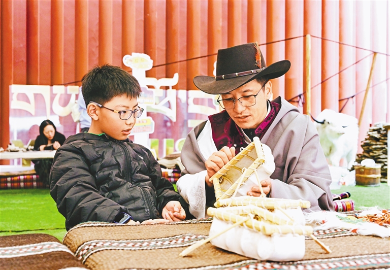 小朋友在西藏牦牛博物館向匠人學(xué)習(xí)制作牛皮船。