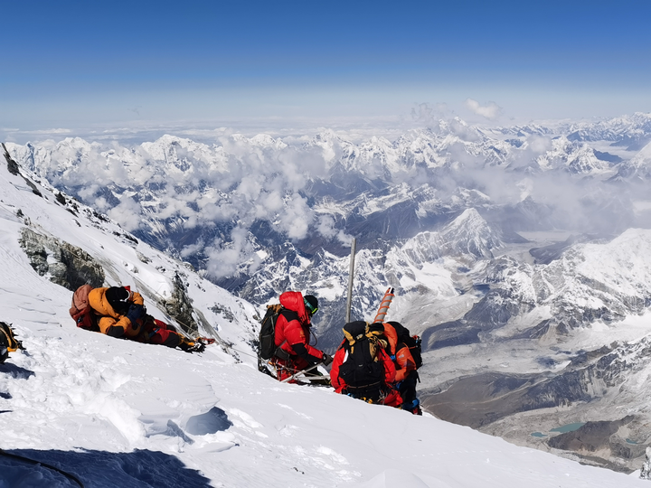 2020年5月27日,2020珠峰高程測量登山隊成功登頂世界第一高峰珠穆朗瑪峰。他們在峰頂豎立覘標(biāo),安裝GNSS天線,開展各項峰頂測量工作。新華社特約記者 扎西次仁 攝