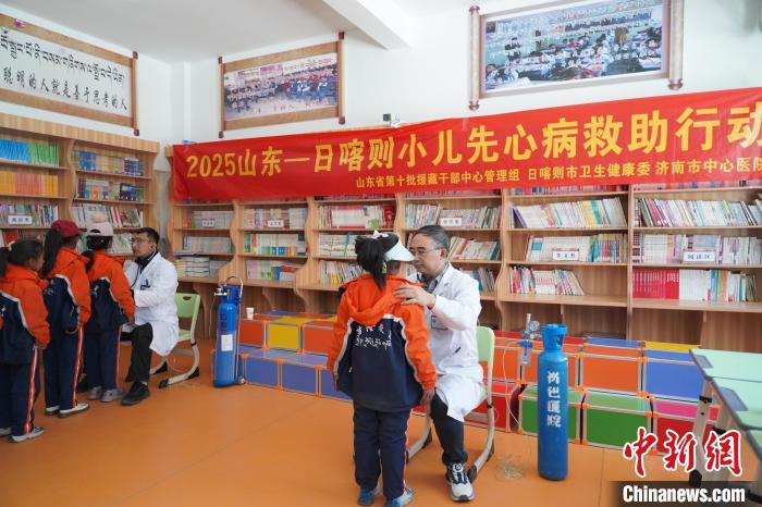 今年5月份,濟南市中心醫(yī)院心外科專家在日喀則市邊吸氧,邊為孩子們聽診。濟南市中心醫(yī)院供圖