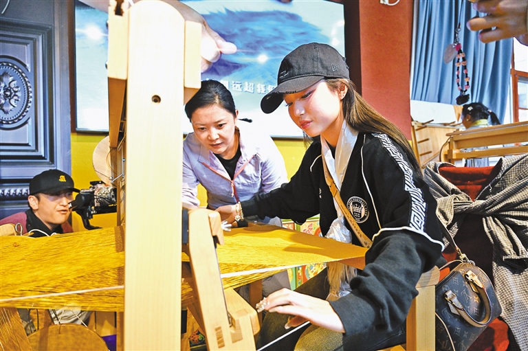 在江孜縣“阿佳格桑工坊”,工坊負(fù)責(zé)人阿佳格桑和江孜縣群團(tuán)工作部黨組書(shū)記、部長(zhǎng)央吉向剛到的日本游客獻(xiàn)上潔白的哈達(dá),歡迎遠(yuǎn)道而來(lái)的客人。走進(jìn)工坊,游客們被精美的藏族氆氌技藝震撼,看著藏族婦女正在編織,便躍躍欲試。在央吉的帶領(lǐng)下,日本游客紛紛踏上編織機(jī),有模有樣地學(xué)起了編織,豎起拇指稱贊不斷。