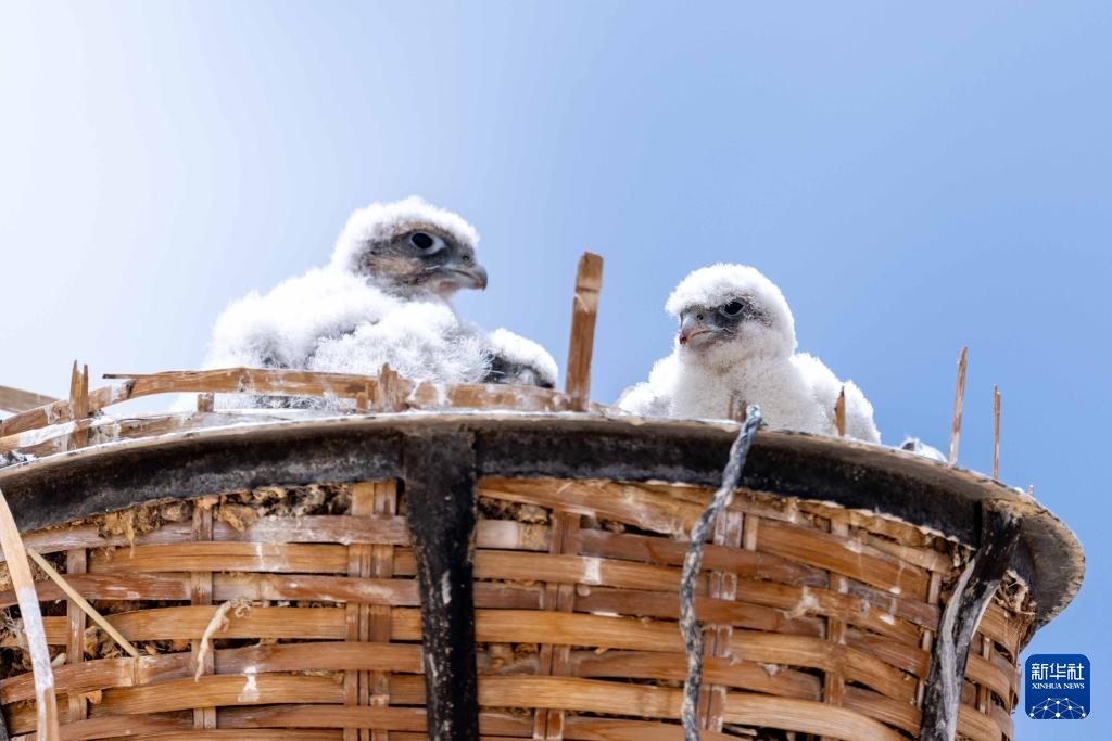 6月7日拍攝的在鷹架上巢中棲息的游隼雛鳥(niǎo)。新華社記者 旦增尼瑪曲珠 攝