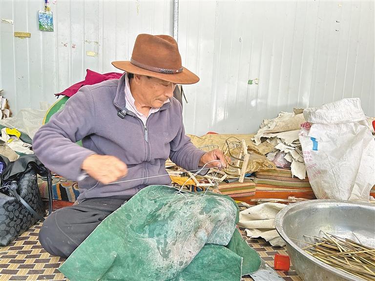 次仁正在制作工藝牛皮船。記者 曉勇 攝
