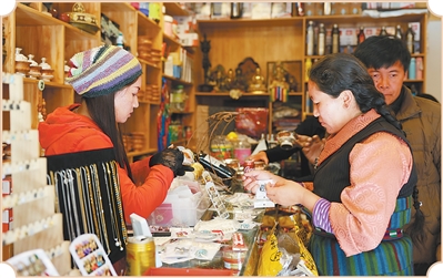 游客在吉隆鎮(zhèn)吉甫村購(gòu)買當(dāng)?shù)靥厣唐?。拉巴宗吉攝